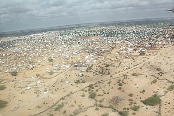 Shelters dot a refugee area in Dadaab, Kenya. Thousands of refugees are flooding into Dadaab every week. Photo by Laura Sheahen/CRS