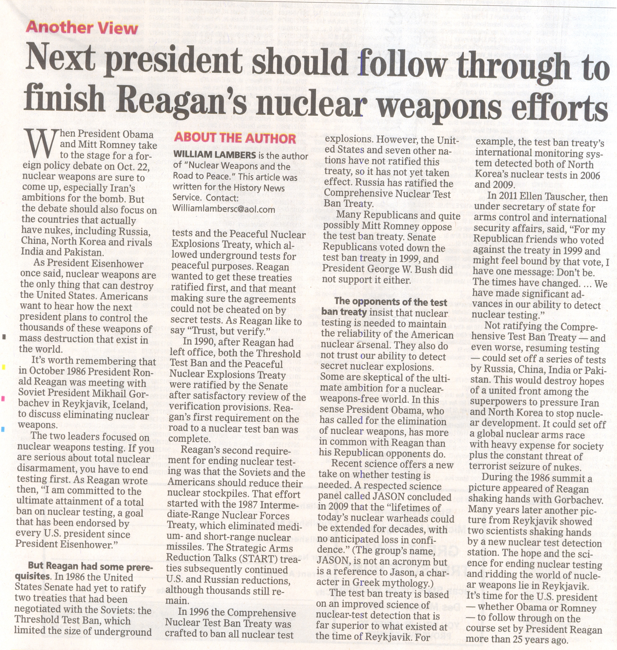 I have written several columns about ending all nuclear weapons testing through the Comprehensive Nuclear Test Ban Treaty (CTBT).