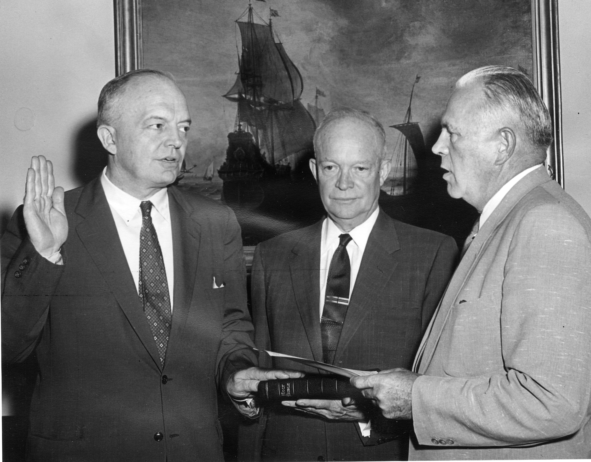 Harold Stassen (far left) being sworn in to represent the U.S. in disarmament negotiations in 1955. (Eisenhower Library)