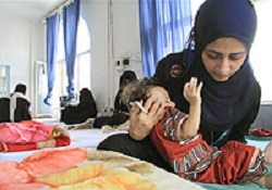 UNICEF Nutrition Officer Dr. Rajia Sharhan holds a young child at a therapeutic feeding centre in Sana'a, the Yemeni capital. (UNICEF Yemen/2011/Halldorsson)