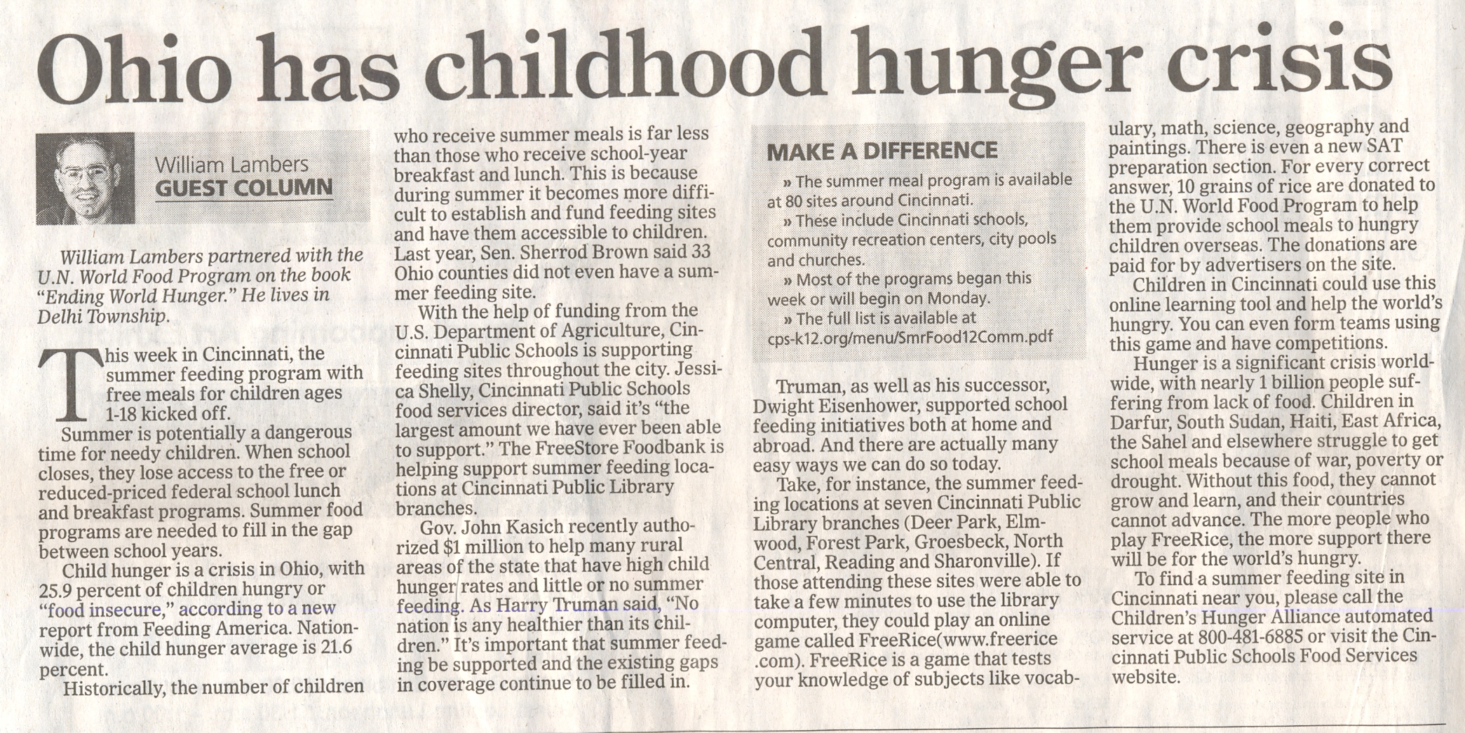 This summer the city of Cincinnati is trying to ensure that no child goes hungry. This is especially critical with Feeding America‘s recent report that over 25 percent of children suffer from hunger or “food insecurity” in Ohio.